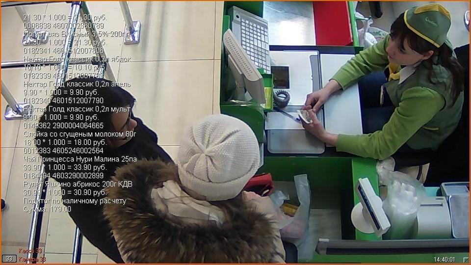 С точки зрения «железа» практически ничего не меняется. Для наблюдения за кассовыми терминалами все также используются сетевые купольные камеры с матрицей 2 Мп или выше, способные вести съемку в разрешении не менее, чем 1920×1080 пикселей с фреймрейтом 25 к/c, по одной на каждую кассу, подключенные к видеосерверу. Ключевое различие заключается в том, что интеллектуальные системы видеонаблюдения тесно интегрированы с IT-инфраструктурой торгового предприятия, за счет чего становится возможен событийный видеоконтроль: операции, совершаемые на POS-терминале, сопоставляются с видеозаписью действий кассира, при этом служебная информация (например, количество и наименование товара, сумма чека) выводится в отдельном окне или в виде титров, наложенных на изображение.