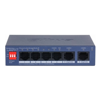 4-портовый гигабитный PoE коммутатор Dahua DH-CS4006-4GT-36 с функцией облачного управления Порты: 4 RJ45 10/100/1000Мбит/с (PoE/PoE+), 2 RJ45 10/100/1000Мбит/с (uplink); мощность PoE: порты 1~4 до 30Вт, суммарно до 40Вт; PoE watchdog, передача до 250м; питание: 53В(DC); рабочая температура: -10°С~+55°С;