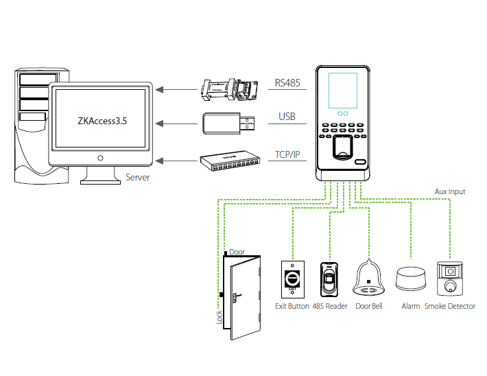 Память шаблонов лиц 1 500, память отпечатков 4 000, память карт 10 000, память событий 100 000. 2.8" TFT дисплей. TCP/IP, USB, RS485, Wiegand. 0 +45 °C. Встроенный считыватель карт Mifare и отпечатков пальцев. ПО ZKAccess3.5
