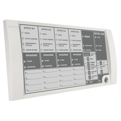 Блок управления и индикации состояния прибора Поток-3Н; 24 индикатора состояния 4 пожарных агрегатов; 14 индикаторов состояния блока «Поток-3Н» и блока «Поток-БКИ»; 1 семисегментный индикатор задержки пуска; 16 индикаторов состояния пожарных и технологических разделов; два интерфейса RS-485; два входа питания, Uпит.10.2...28.4 В, Iпотр.200 мА; IP20, t-раб.-30...+50°С, 340х170х27 мм.