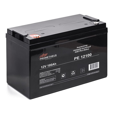 Свинцово-кислотный аккумулятор Prometheus Energy PE 12100 создан по технологии AGM, с абсорбированным электролитом. Предлагаемый аккумулятор является не обслуживаемым. Он герметизирован, а образующийся газ рекомбинируется. Долив жидкости не требуется. Корпус аккумулятора изготовлен из негорючего ABS пластика. Емкость аккумуляторной батареи для ИБП составляет 100 Ah, а рабочее напряжение 12 V. Устройство обладает низким саморазрядом (до 3%). Срок службы достигает 6 лет.