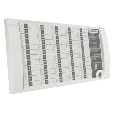Блок индикации и управления для работы в составе ИСО "Орион", 60 индикаторов состояния разделов, 6 одноцветных индикаторов тревог и неисправностей, 1 индикатор состояния блока, 1 индикатор состояния связи блока с сетевым контролером, 1 индикатор наличия системной ошибки блока, 1 индикатор отключения звука, 1 индикатор состояния доступа к управлению разделами; две линии RS-485, встроенный считыватель TouchMemory, U-пит.10.2...28.4 В, I-потр.200 мА (max), IP20, t-раб.-30...+50°С, 340х170х27 мм.