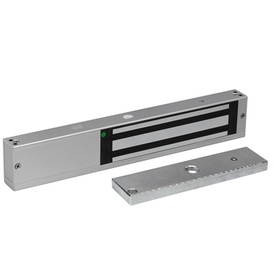 Электромагнитный замок с местом под автономный контроллер. Сила удержания 320-340 кг, датчик положения двери (НЗ), световая индикация (красный), внутреннее исполнение, 12В DC/500 мА или 24В DC/250 мА, -10…+55°C, 311х49х29 мм.