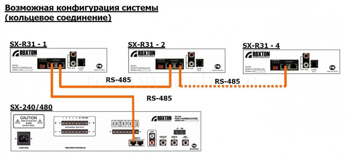 ROXTON SX-R31 имеет встроенный селектор на 5 зон, трансляция может производиться в любую зону, группу зон или все зоны системы. Микрофонные консоли SX-R31 подключаются к центральному блоку SX-240/480 кабелем «витая пара», работают по протоколу RS-485.
