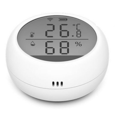 Wi-Fi датчик влажности и температуры с ЖК экраном и возможностью подключения через облачный сервис умного дома Tyua (Smart Life - Smart Living). Питание от батарей 2хААА или microUSB. Поддержка Wi-Fi 802.11b/g/n. Диапазон измерения температуры: 10-55 ℃. Диапазон измерения влажности:0-99%RH. Встроенный зуммер 55 дБ. Настенное крепление.