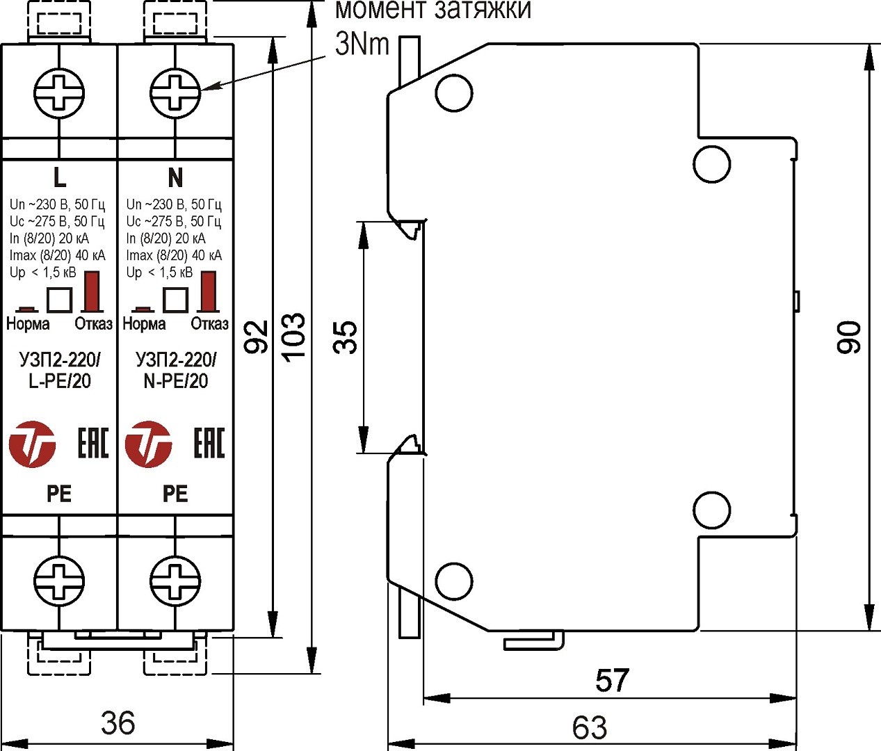 Максимальное длительное рабочее напряжение (Uc) ~275 В / 50 Гц