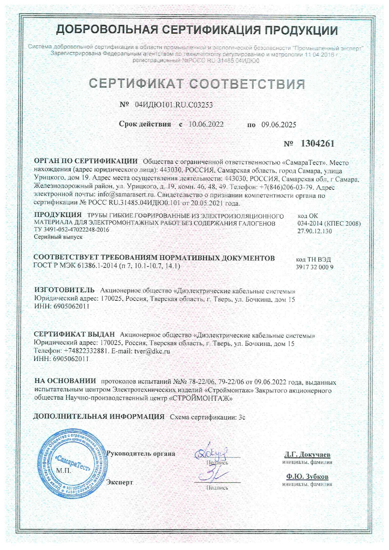 Сертификат Труба ПЛЛ гибкая гофр. не содержит галогенов д.40мм, ПВ-0, с протяжкой,20м, цвет белый