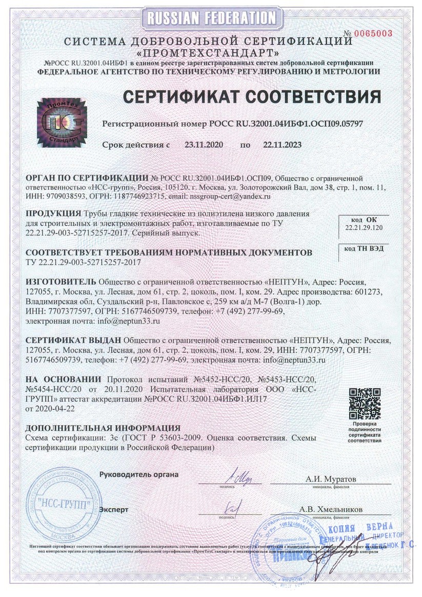 Сертификат Труба гладкая ПНД 25с (2,0мм) (100м/уп) Промрукав 161059