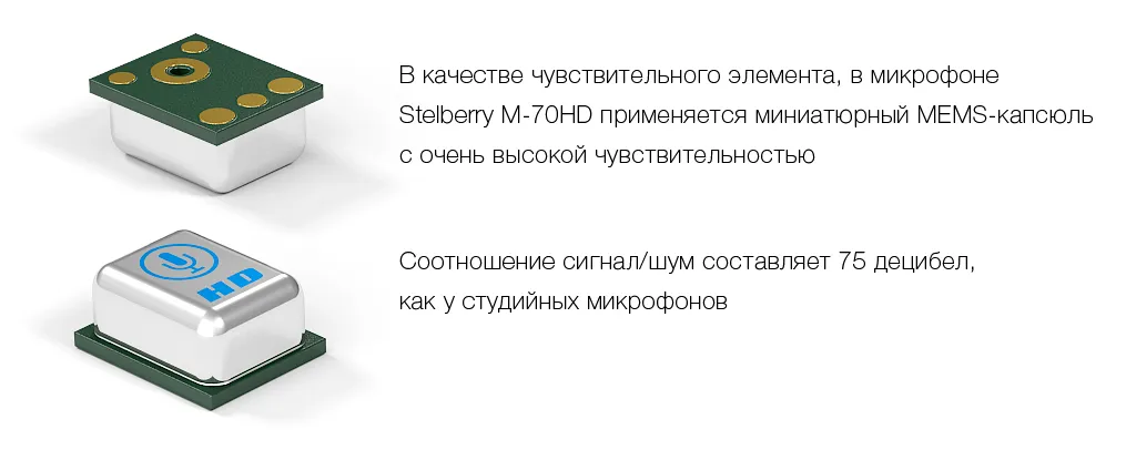 STELBERRY M-70HD оснащен микрофонным MEMS-капсюлем с очень высокой чувствительностью. Даже если записывается очень тихая речь в тихом месте, запись будет высочайшего качества. Чистый звук и понятность речи достигается благодаря высокому соотношению сигнала и шума.