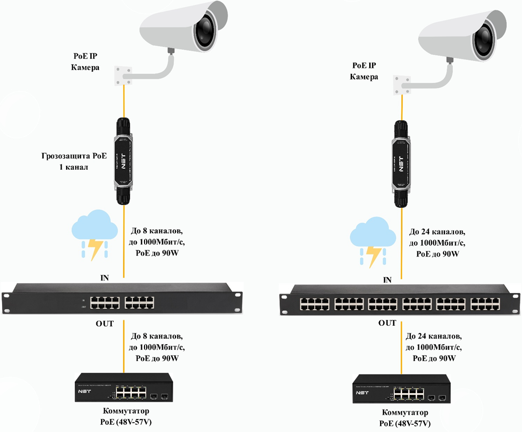 Использование грозозащиты NS-LP на входе линий в здание или коммутаторную, совместно с защищённым коммутатором NS-SW на объекте, создаёт двухуровневую систему безопасности: