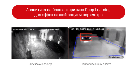 Камеры имеют видеоаналитические функции. Они позволяют отсекать ложные срабатывания тревожной сигнализации от осадков, движения животных и прочего. В тепловизорах используется нейросетевая аналитика которая определяет такие объекты, как «человек» и «транспортное средство». Периметр защищен на расстоянии до 70 м.