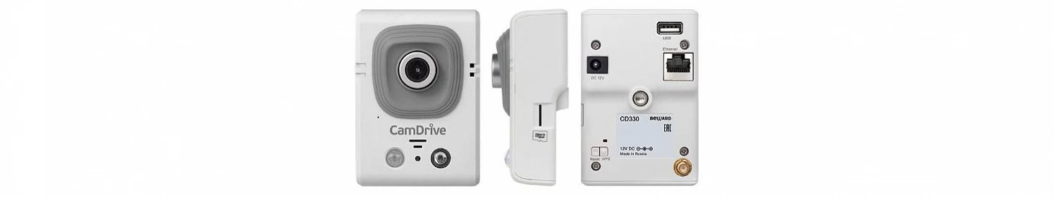 Wi-Fi модуль стандарта IEEE 802.11 b/g/n обеспечивает подключение камеры к облачному сервису CamDrive. Вместо модуля можно воспользоваться подключением с помощью сетевого кабеля Ethernet. Использован стандарт WPS - он делает настройку подключения по Wi-Fi намного проще, обеспечивает надежную защиту при доступе к видеоданным. Примененное шифрование предохраняет от несанкционированного доступа к этим данным. Чтобы камера CD330 работала по Wi-Fi, с другими камерами и устройствами понадобится подключить и настроить роутер (с камерой не поставляется).