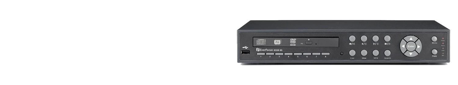Самые простые модели от EVERFOCUS — это бюджетная линейка ELR 4D, ELR 8D, ECOR 4D2 и ECOR 8D2. Все регистраторы отличаются маленькими размерами и прочным металлическим корпусом, правда, их панели управления и интерфейсы для входа и выхода различны. Каждая модель оснащена HDD диском, а также встроенным приводом для записи