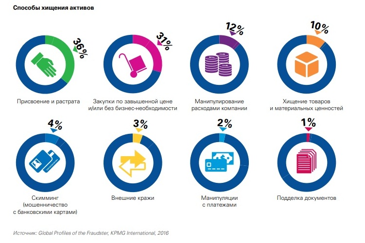 По официальной статистике российский ритейл ежегодно теряет свыше миллиарда рублей из-за краж (по данным «СерчИнформ»), причем от 35% до 80% из них совершает персонал торговых предприятий, тогда как доля хищений со стороны самих покупателей не превышает 20% и приходится, в основном, на магазины самообслуживания. Согласно исследованию, проведенному консалтинговой компанией KPMG, структура правонарушений выглядит следующим образом.