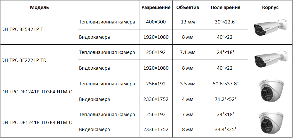 Сейчас Dahua выпускает четыре тепловизионных камеры: две в купольном корпусе и две в цилиндрическом. Эти модели оснащены одинаковым набором интеллектуальных аналитических возможностей и отличаются лишь разрешением их тепловизионного модуля и фокусным расстоянием объектива. Клиент может выбрать оптимальный вариант устройства исходя из требований и финансовых возможностей заказчика.