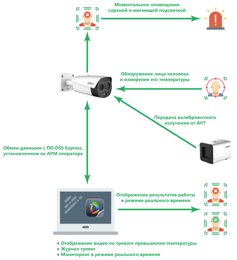 Эти устройства представляют собой камеры с оптическим и тепловизионным объективами. Камеры оснащаются детектором лиц, что дает возможность измерять температуру только в области лица. Если камера фиксирует превышение температуры, подается тревожный сигнал в виде звука и света, а также оповещение на видеорегистратор и в ПО DSS Express. Оператор системы наблюдения делает контрольное измерение температуры медицинским термометром, чтобы получить более точные результаты и принимает решение основываясь на его показаниях.