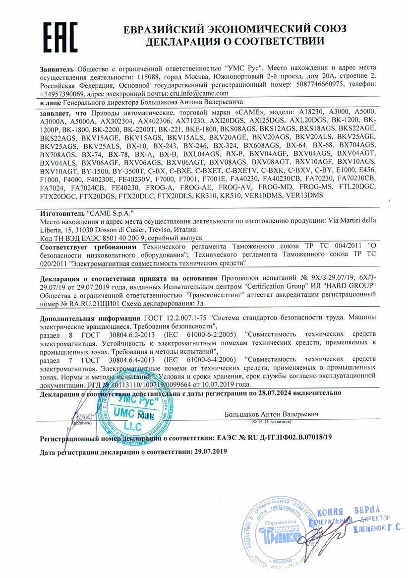 Совместимость: CAME BX-A, CAME BX-В, CAME BX 241, CAME BK1200, CAME BК1800, BKS12AGS