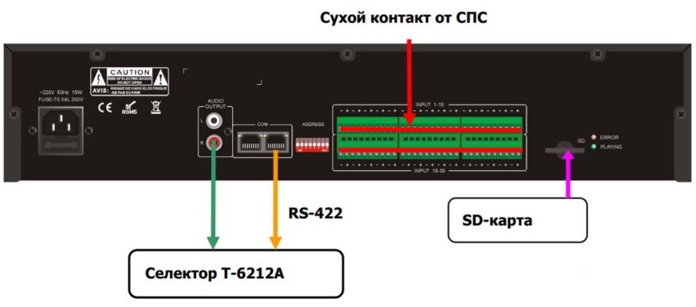 Аварийный интерфейс принимает сигналы в виде “сухих контактов” от Охранно-пожарной сигнализации (ОПС) и других внешних систем, активируя тем самым запуск воспроизведения цифровых сообщений, предварительно записанных на карту памяти стандарта Secure Digital (SD).
