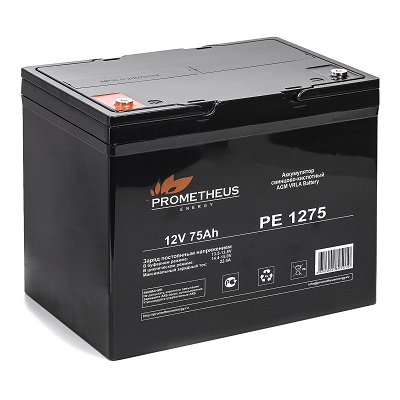 Свинцово-кислотный аккумулятор Prometheus Energy PE 1275 создан по технологии AGM, с абсорбированным электролитом. Предлагаемый аккумулятор является не обслуживаемым. Он герметизирован, а образующийся газ рекомбинируется. Долив жидкости не требуется. Корпус аккумулятора изготовлен из негорючего ABS пластика. Емкость аккумуляторной батареи для ИБП составляет 75 Ah, а рабочее напряжение 12 V. Устройство обладает низким саморазрядом (до 3%). Срок службы достигает 6 лет.