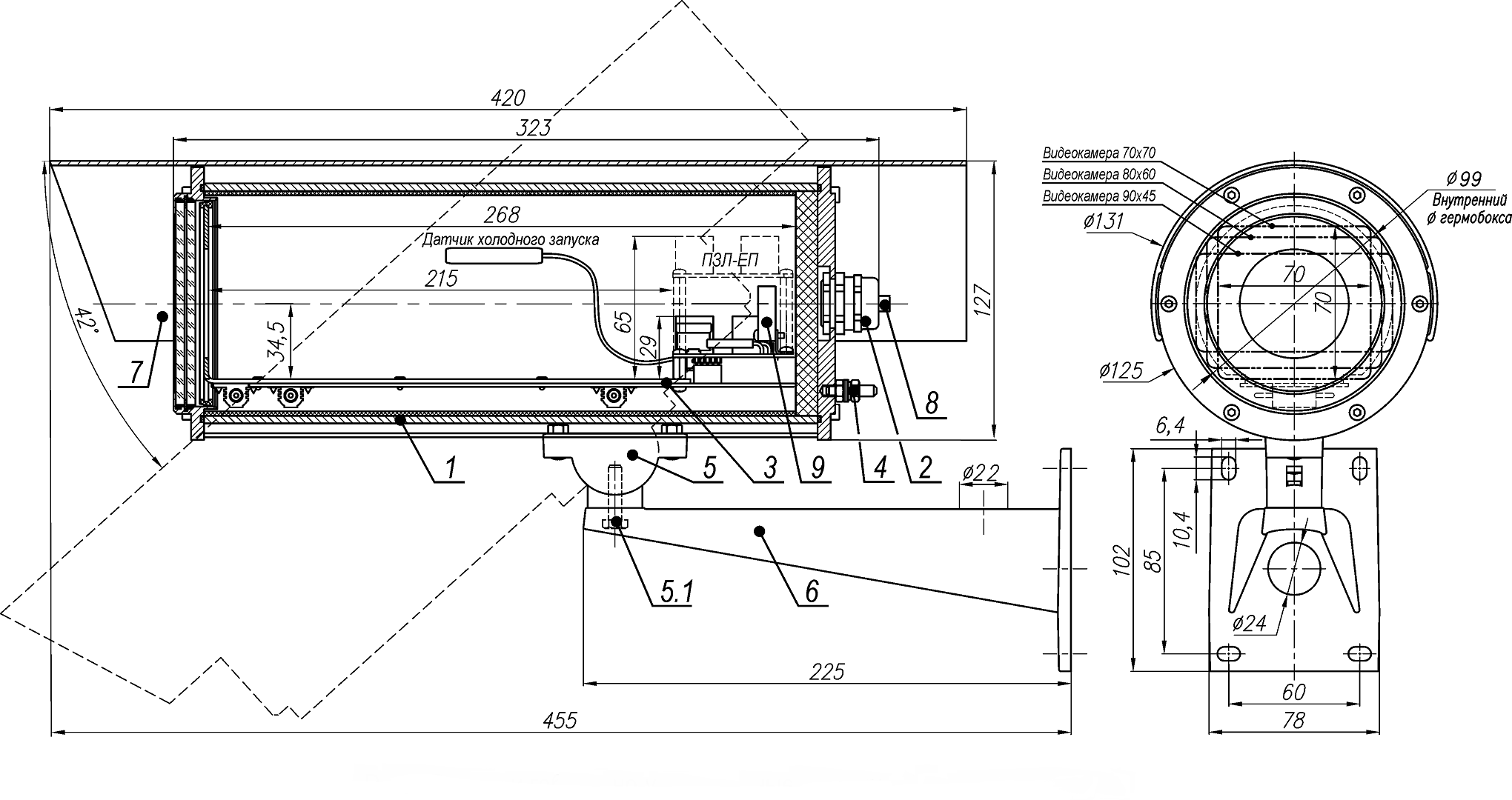 ТГБ-7 PoE+ исп.1 Термокожух для видеокамеры. Класс защиты IP66/IP67. Рабочий объем 70х70х215 мм. Питание термокожуха по стандарту IEEE 802.3at (PoE+). Питание видеокамеры по стандарту IEEE 802.3af (PoE). Мощность обогрева 25 Вт. Диапазон рабочих температур -60°С…+50°C. Холодный пуск. Два гермоввода под кабель диаметром 4-5мм, позволяющие вводить кабель с обжатой вилкой RJ-45.