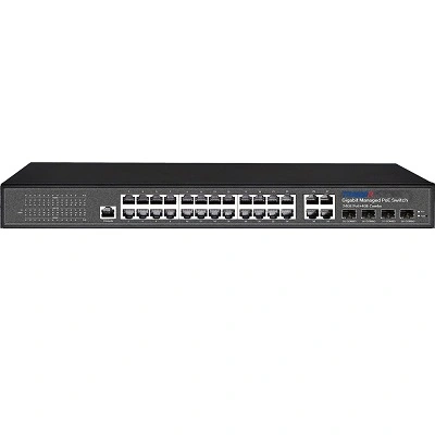 Управляемый коммутатор TRASSIR уровня L2+ с 24 PoE портами (10/100/1000Base-TX PoE port) и 4 COMBO( SFP+RJ45) портами; стандарты PoE EEE802.3af, EEE802.3at, EEE802.3bt максимальная мощность на порты 1-2 90Вт, на порты 2-24 30Вт, общая - 400 Вт. Максимальная потребляемая мощность 400 Вт. Молниезащита и ESD, защита IP30. PD- Alive 180сек. Топология подключения: Каскад, Звезда,Кольцо. Максимальное расстояние передачи по POE до 250м. Рабочая температура: -20...+55ºС. Габариты: 440x290x45.