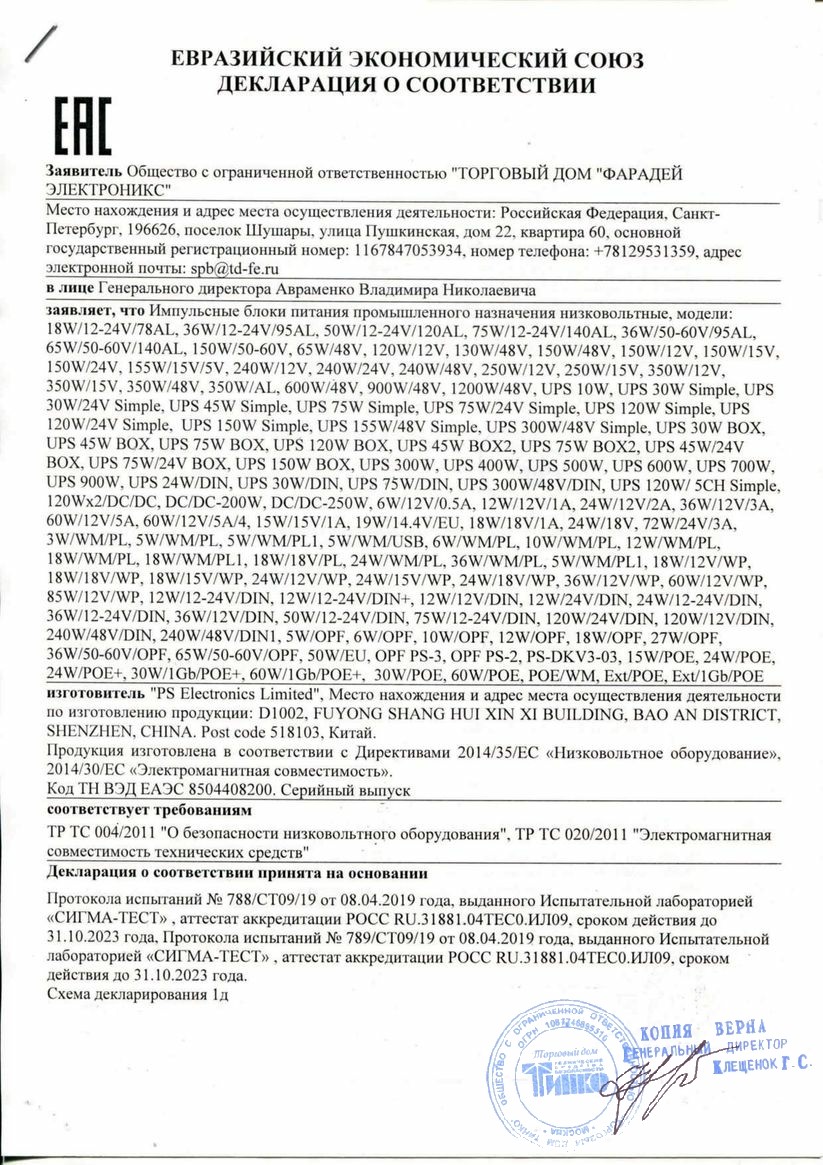 Декларация о соответствии UPS 300W Simple