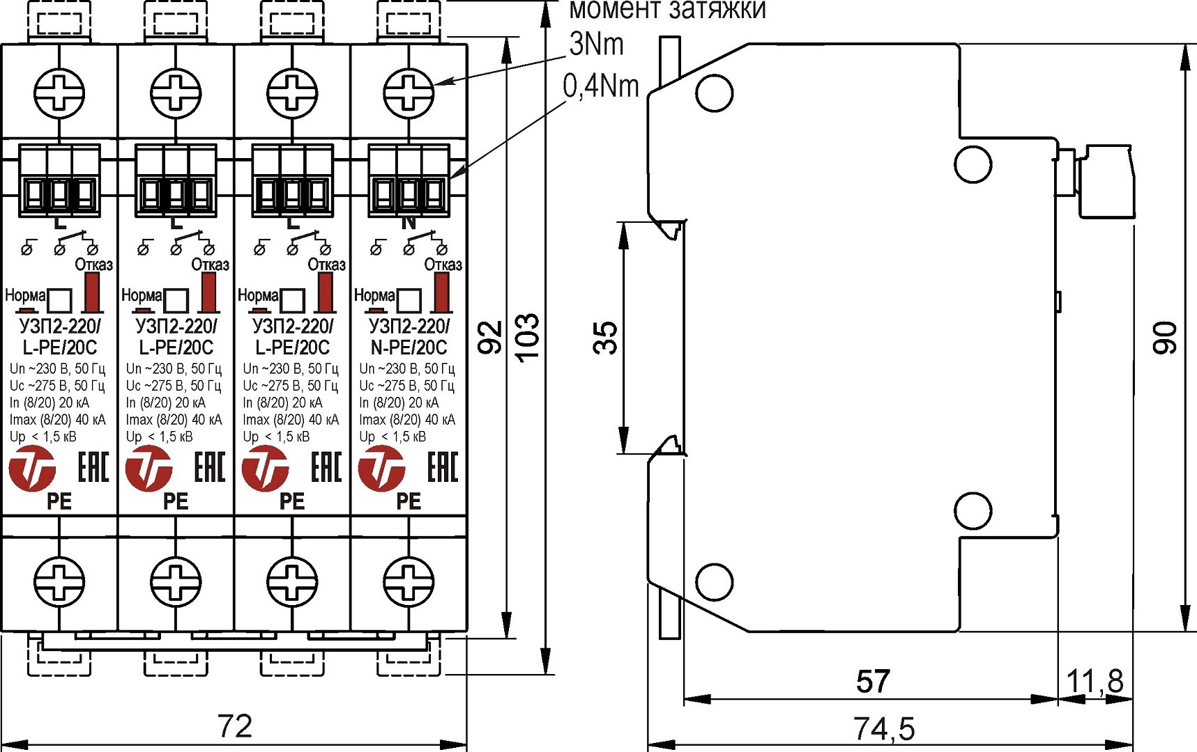 Максимальный разрядный ток при tимп. 8/20мкс (Imax): 40 кА