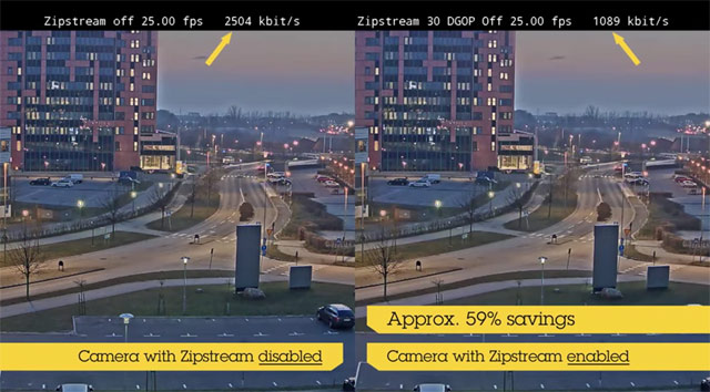 Технология Zipstream реализована в виде модуля, который встраивается в механизм сжатия видеоданных в сетевой камере. Наиболее значимые участки сохраняются с полным качеством изображения и разрешением, а другие части изображения подвергаются сглаживанию и сжатию данных для оптимального использования имеющейся пропускной способности и ресурсов хранения данных. Сокращение объёма записей примерно на 50% снижает затраты на приобретение накопителей.