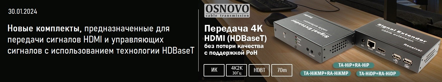Osnovo выпустили новые комплекты, предназначенные для передачи сигналов HDMI и управляющих сигналов с использованием технологии HDBaseT. Этот протокол позволяет передавать аудио- и видеоданные высокой четкости, а также управляющие сигналы и электроэнергию для приемного устройства по стандартным кабелям категории Cat5/6.
