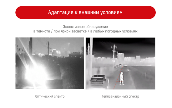Камеры имеют видеоаналитические функции. Они позволяют отсекать ложные срабатывания тревожной сигнализации от осадков, движения животных и прочего. В тепловизорах используется нейросетевая аналитика которая определяет такие объекты, как «человек» и «транспортное средство». Периметр защищен на расстоянии до 70 м.