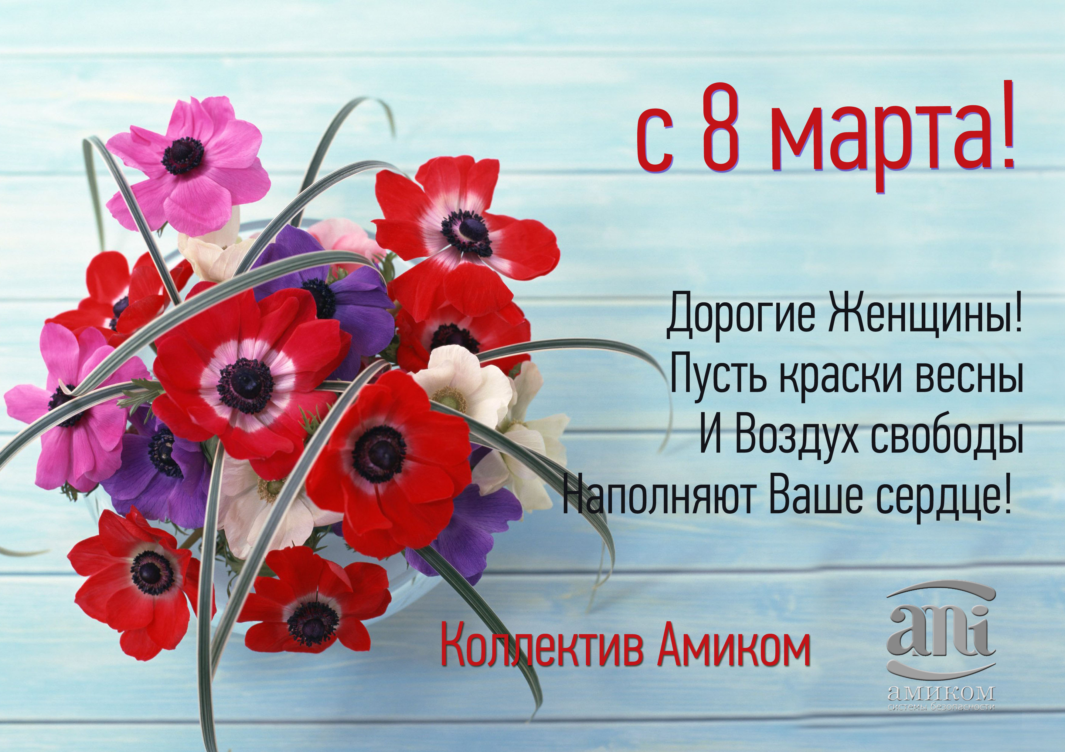Поздравляем милых дам с международным женским днем 8 марта, с этим радостным весенним праздником. От всей души желаем Вам быть успешными на работе, благополучными дома и любимыми везде. Желаем Вам крепкого здоровья, неувядаемой молодости и неиссякаемой бодрости духа. Пусть у Вас все всегда получается, а мечты исполняются вовремя. Будьте счастливы!