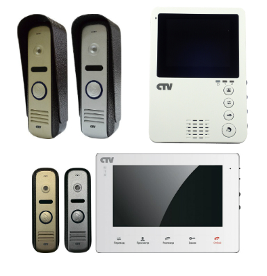 Для расширения домофонных систем предлагается линейка мониторов с различными размерами экрана и разнообразными встроенными функциями. Компактные мониторы CTV-M1000 с диагональю 10 см (4 дюйма) поддерживают систему Hands Free, а также возможность подключения к ним до двух вызывных панелей и дополнительной камеры охранного видеонаблюдения. Предлагаются в двух модификациях - с черным или белым цветом корпуса.